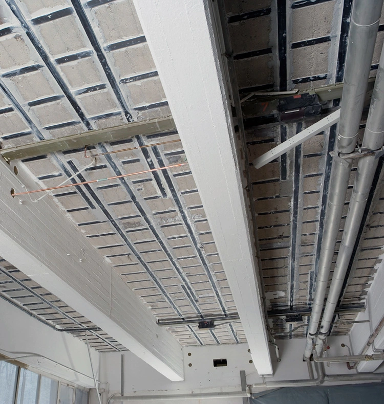 Standard reinforcing measures with steel beams or steel embedded in shotcrete quickly reduce clear component heights by between 10 and 15 cm. However, surface-bonded CFRP lamellas exhibit thicknesses of less than 0.5 cm – including the adhesive. And with CFRP lamellas moulded into slots in the concrete, the clear height remains completely unaffected. For structures such as railway and road bridges, ceiling slabs, and roof girders in multi-storey car parks, it may be essential that previous dimensions are retained, or subject to no more than a minor reduction. With these systems, even the piping and ducting installed along the surfaces do not need to be removed.